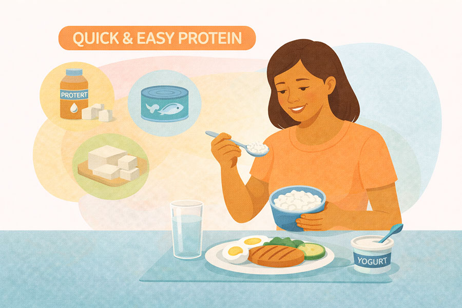Eggs – If you’re in a hurry, hard boil eggs in advance and eat one or two at breakfast.Fish – Salmon contains high levels of the essential fatty acids every mother needs. Besides eating it fresh, you can find salmon jerky in many health food stores. Try to minimize fish at the top of the ocean food chain – like tuna, shark, or swordfish – because mercury and other toxins increase as you move up the chain.Lean meat – For convenience, many health food stores sell different kinds of tasty “jerkies” made from beef or turkey, but without any nitrites.Nuts – Almonds are particularly high in protein; almond butter on a rice cake topped with apple slices is a delicious and healthy breakfast.Soy – You can add soybeans to stews or soups, or toss tofu chunks into your stirfry or casseroles. Try replacing half or more of the wheat flour with soy flour. Soymilk comes in many flavors, and you may be surprised to find that your children really like it.Hummus – This Middle Eastern food is made from garbanzo beans and sesame seeds. You can buy it in most supermarkets or make your own, lower-fat version.Protein shakes – If you are going to use these regularly, alternate types of protein powder (such as whey-, soy-, or egg-based) to get a good variety.Dairy products – Although milk, cheese, and yogurt are good sources of protein, they are best consumed in moderation because many people have an allergy to milk or cannot digest the lactose in it, and keeping the digestive tract in good shape is a top priority for a mother. If you have trouble with dairy, goat milk products may be tolerable.Combining vegetarian foods – If you’re a vegetarian, you probably know about using food combinations (like rice and beans) for maximum protein. (Diet for a Small Planet or Laurel’s Kitchen offer good introductions to this subject.) Since meat is the only significant source of iron and vitamin B12 in the diet, a vegetarian should usually take these as part of a daily supplement.